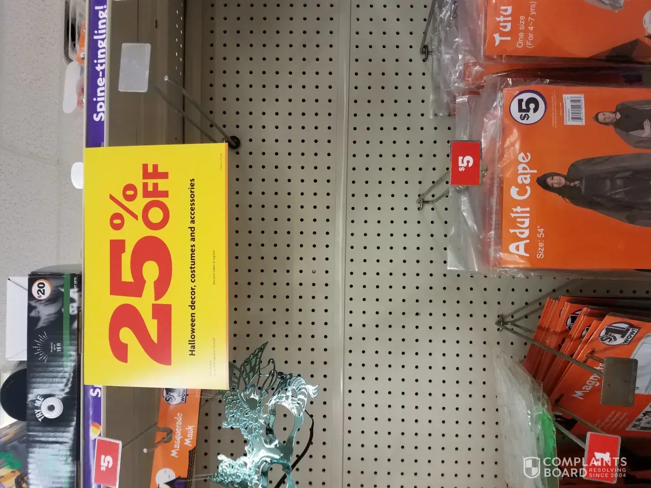 Went to buy my grandsons friends hair color and face paints, sign says 25% off costumes, decor and accessories. Grabbed all the items that I need it got to the register the young lady charged all my items. The 25% didnt come off so she called the supervisor by the name of jovanna, she told me that the items were not a part of the cell that the face paint was but the Halloween hair color is not an accessory and it was a non seasonal item I work in retail and knew that she was wrong in front of customers continue to be disrespectful and would not give her name so the lady at the register wrote her name and corporate number down for me. Please correct me if im wrong...
