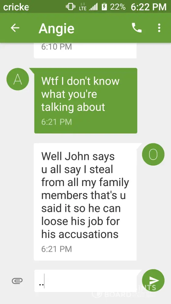 My sister told John o steal from my family memebers I did text her and she texted back soon tknow what the [censored] I am talking about I have screen shots of these messages