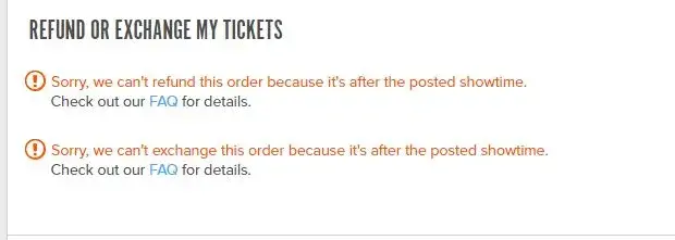 VIP accounts accepting the refund policy terms user license and agreement etc. Fandango will not issue a refund after showtime no matter what unexpected or expected circumstance happened. Clearly, when you walk into the theater a ticket master processes your confirmation number. This should store who made it to the show. So, since I never made the screening time, why is it that as it seems obvious I didn't attend I don't get a refund? The unwillingness for certain exceptions is unreasonable. If there was an emergency? Forget it. They keep all proceeds you didn't use if its after showtime.