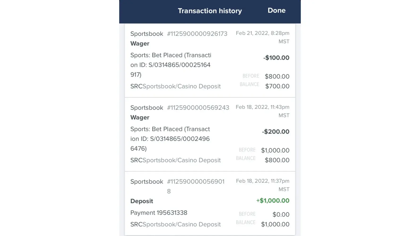 Feb 18, 2022: $1,000 deposit