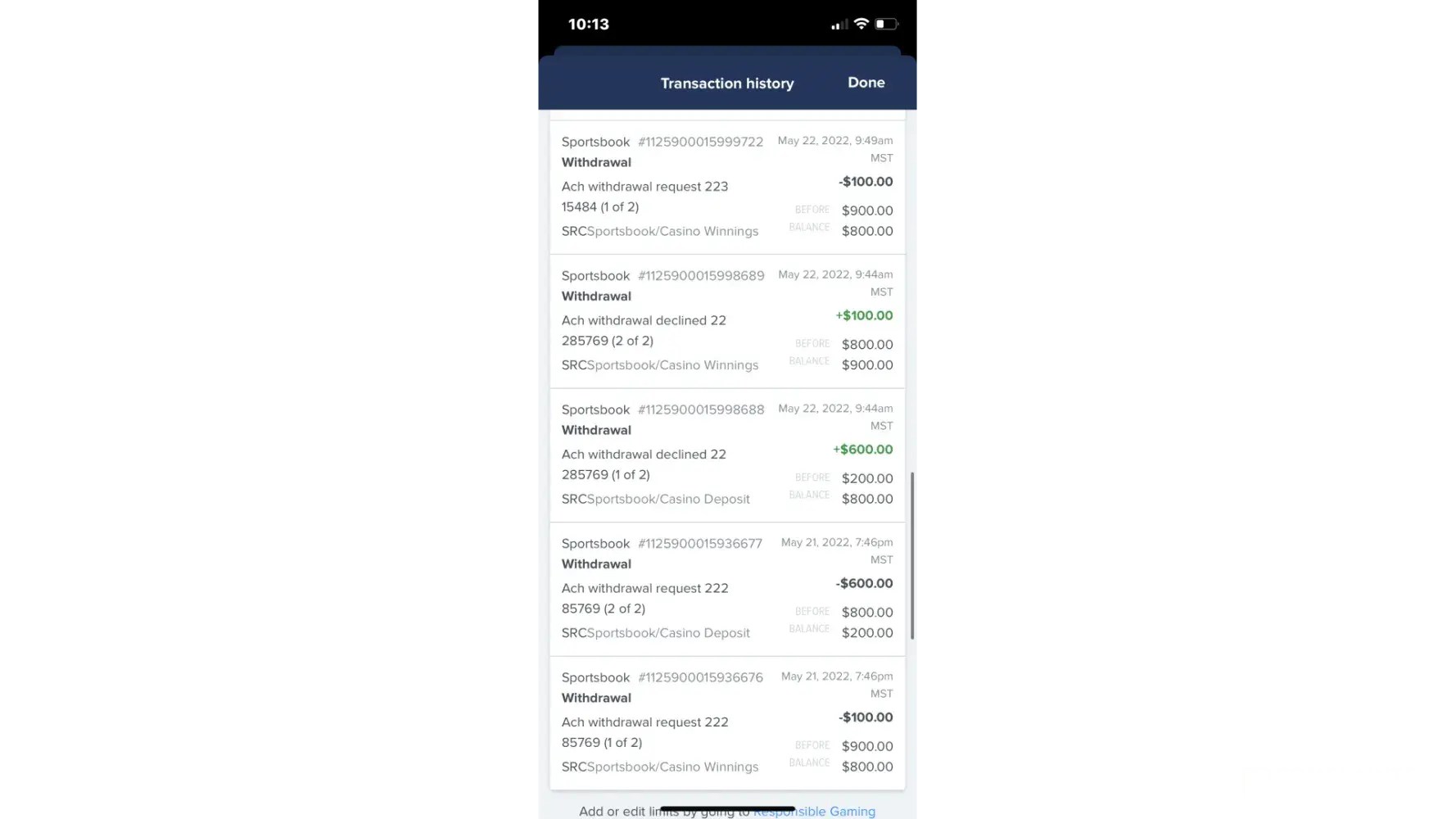 May 23, 2022: $100 withdrawal approved by FanDuel (Payable Account Balance: $600)