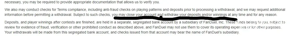 Edit: Just received the response to this review from FanDuel. Stating that I should be sure to contact the support team. I did contact the support team prior to writing the original review. They could not even provide a breakdown of how they were calculating how much I could withdraw vs. how much I still had to wager. All they could continue saying was those are the amounts listed on my account. Even tho I continually showed them I gambled much more than was deposited on my last deposit (after it was deposited) and was trying to withdraw much less than winnings that occurred after that deposit. They stated they would have some contact me via email and that had yet to happen. My wife also has an issue with her account where they are refusing to honor the “no sweat first bet†after depositing and losing $1000 on her first bet. Again we’re told we would be contacted via email and still nothing.
