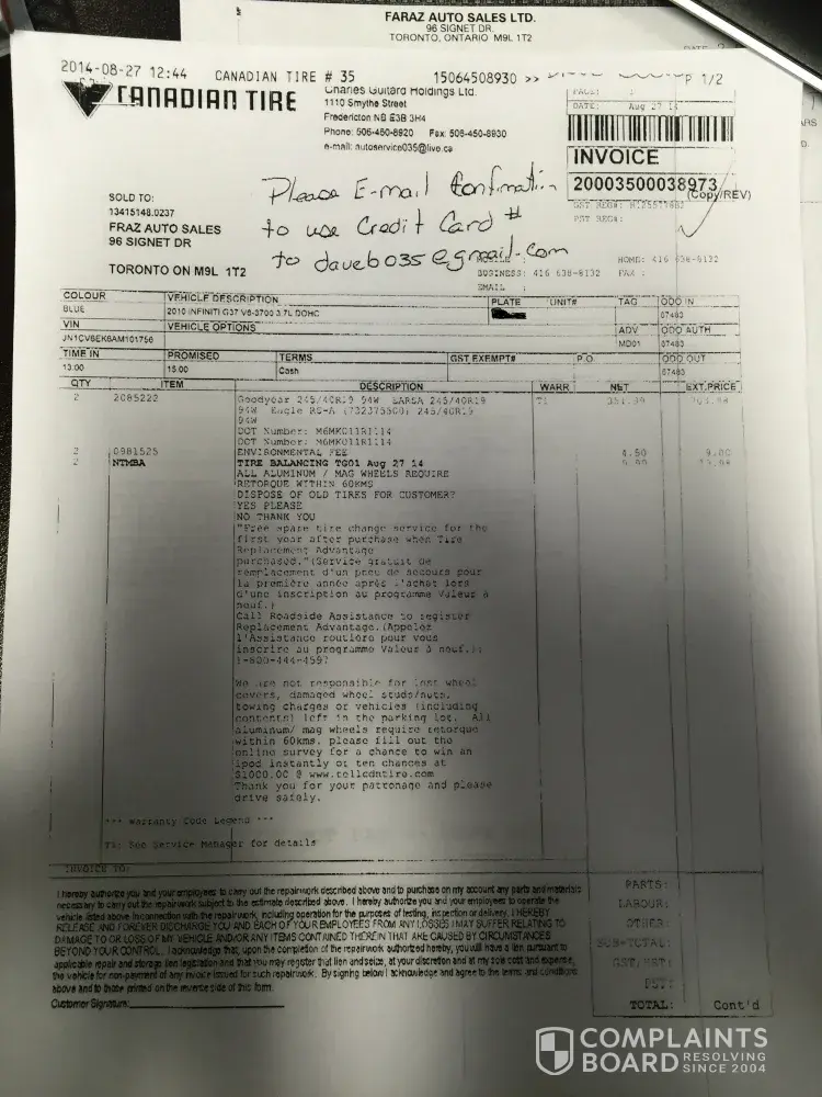 Manager at faraz auto sales and I would like to start with my sincere apologies in your recent experiences, We have not received any pictures or emails( you can contact me direct for any issues your incurring at [protected]-( and email me at ali@farazautosales.com) I can understand your frustration, and your feelings as purchasing a new car the last thing you would expect is headaches, I can assure you that we take responsibility for all errors made and have all vehicles checked at a licensed mechanic prior to sending our vehicles out all vehicles are certified to mto standards and full mechanical inspections are available as well upon customer request, I do apologize that you were driving and you experienced problems that is the last thing we want for any valued customer, We do not have control if aftermarket parts are installed on used vehicles we can only do are dudiligence to make sure that vehicle is in working order and safe, I stand behind our product and do what I can assist you further because to me your not a one time customer. In terms of your warranty all terms and conditions and coverage are stated if you weren't covered for any covered components that were listed I would defiantly step in to assist, but as for the lights, I have no control on product that was used with previous owner of the vehicle as you know the vehicle was off lease, As for tires that were put on prior to delivery I have a invoice from tire shop and licenced mechanic that changed the tires which were in good working condition, we did do our part to compensate you immediately to Canadian tire for the tires for replacement,