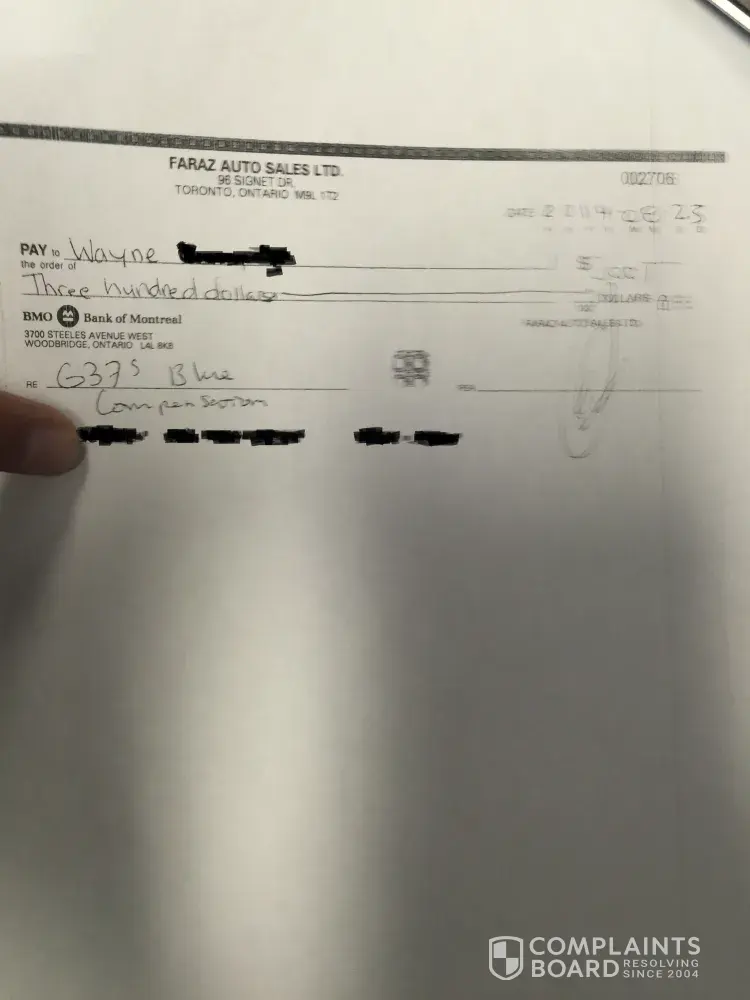 I apologize for the late reply as I thought the above matter had already been resolved. Unfortunately after 20 years in business we have experienced a customer that we were unable to satisfy. With our family operated business, we keep records and files on all of our vehicles. Our customer satisfaction is very important to us. We try to go above and beyond for all of our customers because we don't see our clients as one time buyers, but instead as long term respected customers to our business. In response to Ali786110, we genuinely apologize for your unsatisfaction for 3N1CD51D56L631542 it NISSAN SENTRA 1.8L Special Edition Sliver. In buying a vehicle from our company you were informed that the Car Proof was declared no accidents or damage. However we also informed you that based on our own due diligence and experience we identified that the vehicle door had been replaced. We also offered Mr. Ali786110 to have the vehicle inspected at any mechanic or Nissan dealer of his choice. Also in to response to Mr. Ali786110, he bought the car on MAY 1, 2011. On the bill of sale we disclosed and had Mr. Ali786110 initial that the vehicle had prior paint work from previously from the first owner, and the door was replaced. One year later in JUNE 2012, Mr. Ali786110 had brought back the vehicle with an additional 30, 000 km and asked us to take back the vehicle. He said that he was trading his vehicle for a Buick and no longer liked the Sentra. The dealer he was trading it to said they would give him $2500, so Mr. Ali786110 requested our help to do better. I, as the manager of Faraz Auto Sales, was more than happy to help out our old customer and bought back the car for $3000. I have attached a copy of the vehicles Car Proof, at the time the vehicle was purchased, for our viewers to confirm that there was no declarations of any accidents that we neglected to notify our customer about. And that we took extra initiative to declare the door being replaced and previous paint work.