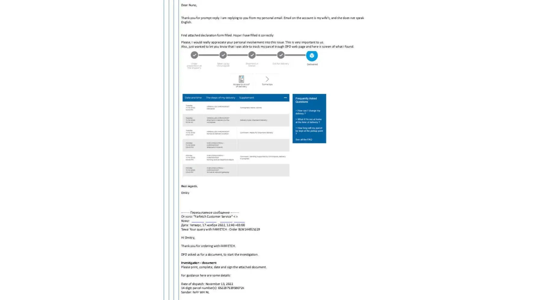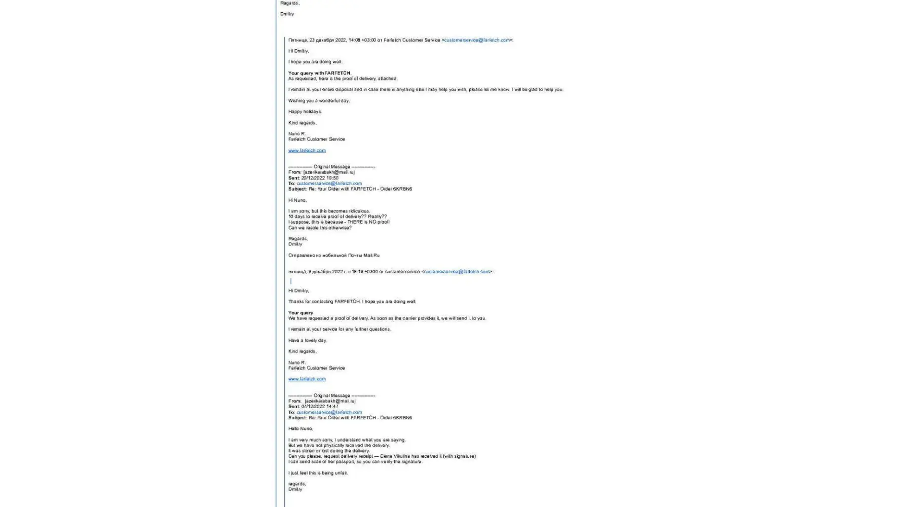 I was asking for a refund of funds, however Farfetch replied that delivery is made and refund is not possible. When I asked for a proof of delivery with signature of acceptance, Farfetch replied with document 4 which is complete nonsense as it has no proof of delivery and no signature of my wife.