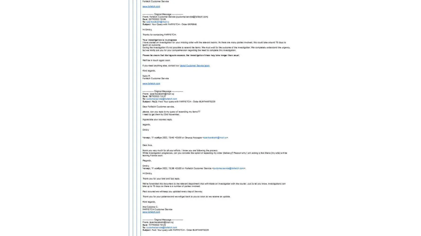 I started a chain of emails with Farfetch customer service (see 2 and 3 - 8 pages of emails).