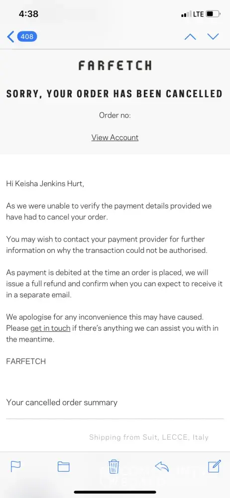 I have tried three times to order a purse from Farfetch. The first time, I was charged but then got an email 3 days later saying they couldn't verify my payment information (fishy) and my order was canceled. I placed a new order with a different credit card. Again was told it was canceled, but that charge is STILL pending on my credit card. I called support and was told there would now be a note on my account and my next order should go through with no issues. Two days later, I get an email asking me to send a picture of my ID and credit card. That's when I started googling and realizing a lot of people have had issues like this. Now I have two charges, one on each credit card, that are pending and have not yet been canceled. This was very fishy to me and I've never had these issues with my card before (I have a Chase Sapphire Reserve card, those are pretty well trusted by most online vendors). I'm concerned about if I will get my money back for multiple purchases and I don't even have the item.