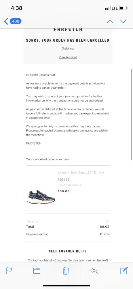 I ordered a pair of adidas falcon sneakers that was on sale for $86.00 that was suppose to delivered two days later. I was eagerly checking my emails looking for an exact shipping time the item would have been delivered. Two days later I receive an email stating my order has been cancelled due to a payment issue. How was there an Issue with the payment when my card was charged. Obviously the payment was fine. I contacted Farfetch on the 646 number provides for US customers on the email and spoke with a lady who had a very thick French accent, who stated that my order was canceled because they wanted to verify my information with me and my bank . Huh! I asked her what type of information needed to be verified. She couldn't give me a specific answer. She kept asking me would I like to reorder the item and then they can contact me and my financial institution directly. I told the women I'm not comfortable with any one contacting me or my bank to verify anything. I accused her of being involved in a scam situation she then proceeded to read this long and pitiful speech about how it's safer for their customers and their financial institutions just to verify the information. She continued to ask me permission to reorder the item and again contact me or my bank, she kept asking "is that alright with you " I told her absolutely Not. I told her I don't feel comfortable providing any more information as it's not needed to place an order. My card was charged so what was the payment issue. I told her I will look into this matter further do my research and if I wish to reorder anything I will contact you and hung up. I went on line and researched and read some similar experiences on scams that they use to receive your personal information. Do Not Buy From Farfetch. Where have you ever heard of a company trying to contact your bank to verify info about your credit card that already went through. BEWARE!