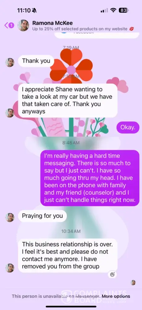 I reached out to customer service this morning, 10/23/24, and asked about an order and about my order sponsor being changed. My order sponsor messaged me last week and said she no longer wants any business dealings with me and my daughter in law and blocked all contact and communication. She told me to no longer contact her and I cannot when she blocked me. Not very professional. I sent in a complaint and also a message and she is still our sponsors. I have received no update and we would like to order but won’t as long as things remain the same. The customer service rep hung up on me. Again not very professional.