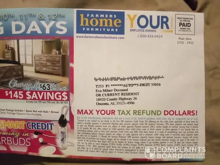 Why they sending me papers with my dead mother name on it with deceased out by her name what are doing rubbing it in because she has past away just because I owe them some money they causing trauma on me sending those papers to me rubbing it in because my mom is deceased that is causing mental issue with me