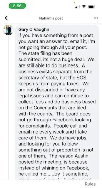 Gary Vaughn refuses to schedule and have HOA meetings, provide financial documents, enforce covenants, respond to homeowner's emails, questions and concerns. When approached on these matters he becomes belligerent, defensive, and ugly.