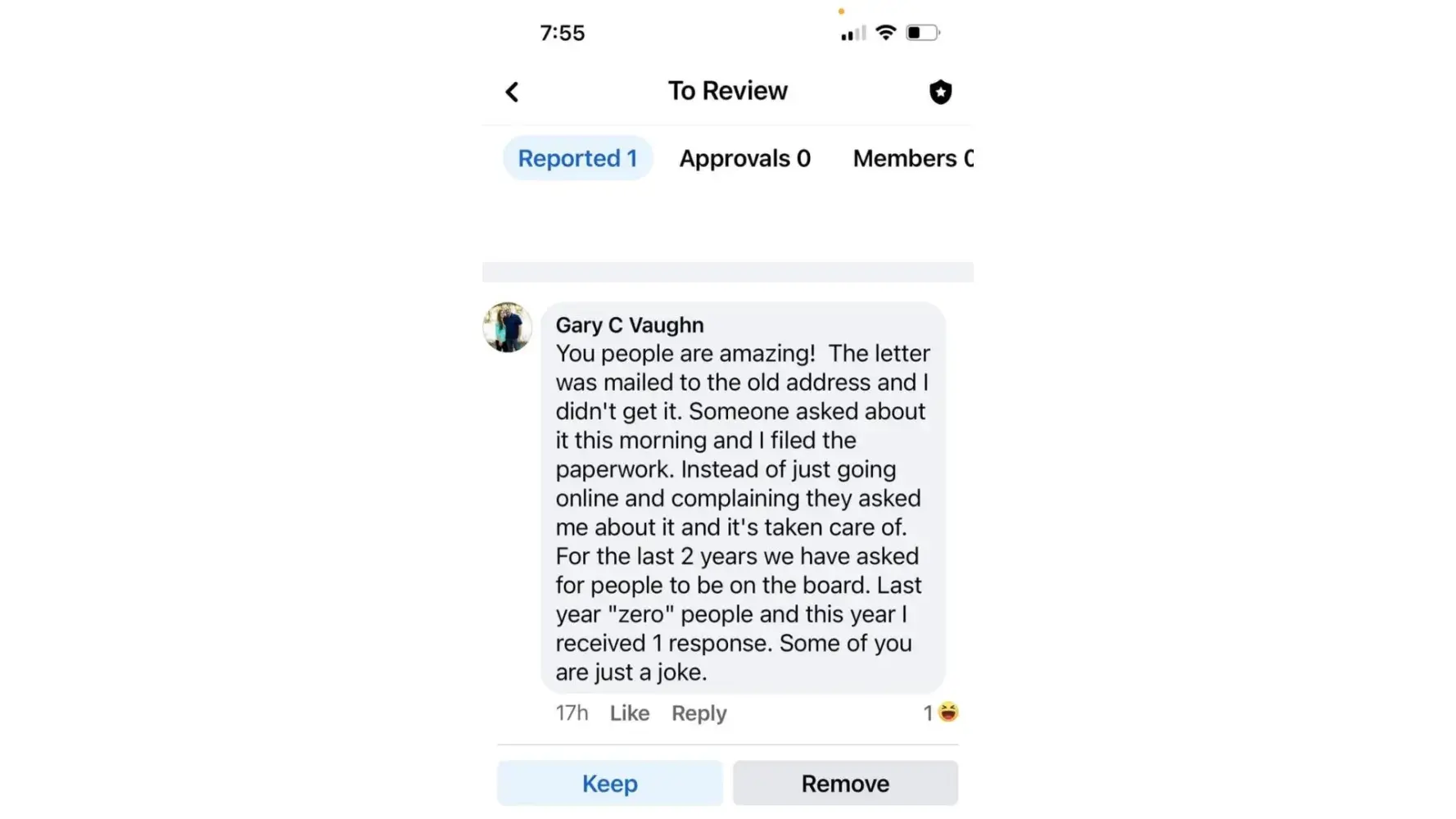 He has been warned about his behavior in our online subdivision Facebook group/page. He is now limited, and his comments are reviewed prior to being allowed to be posted.