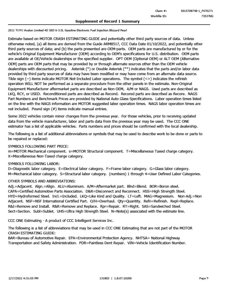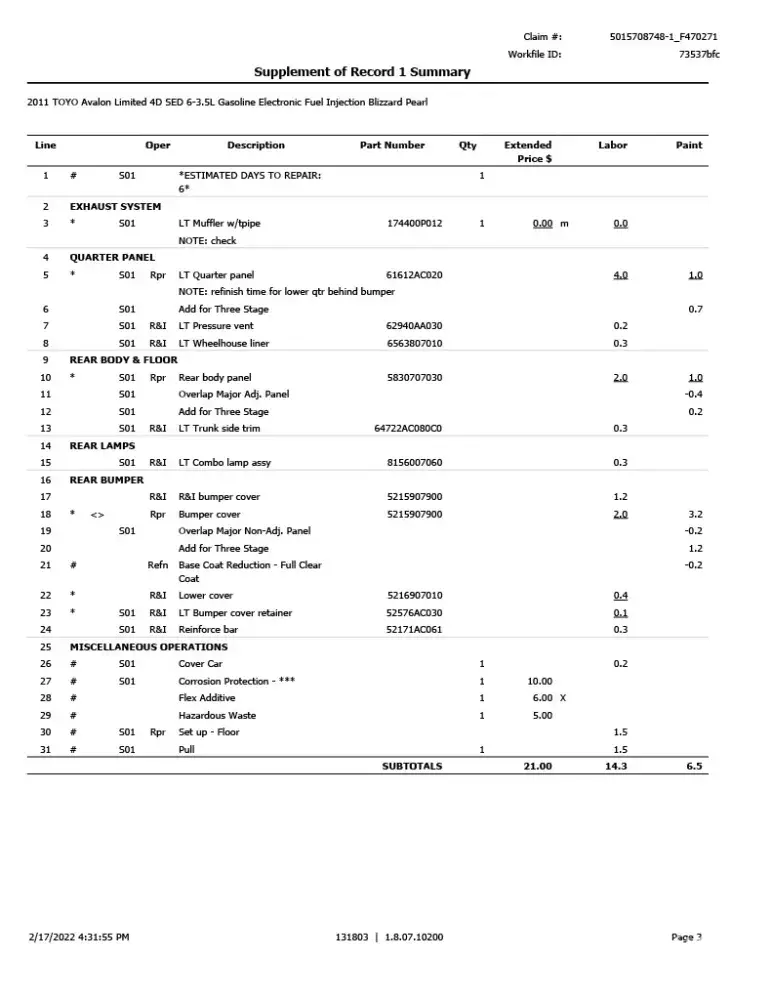 As I will most likely be repairing the car myself, I want an accurate estimation of the damage done for the cash settlement. Estimates from Farmers and the Body shop are attached.