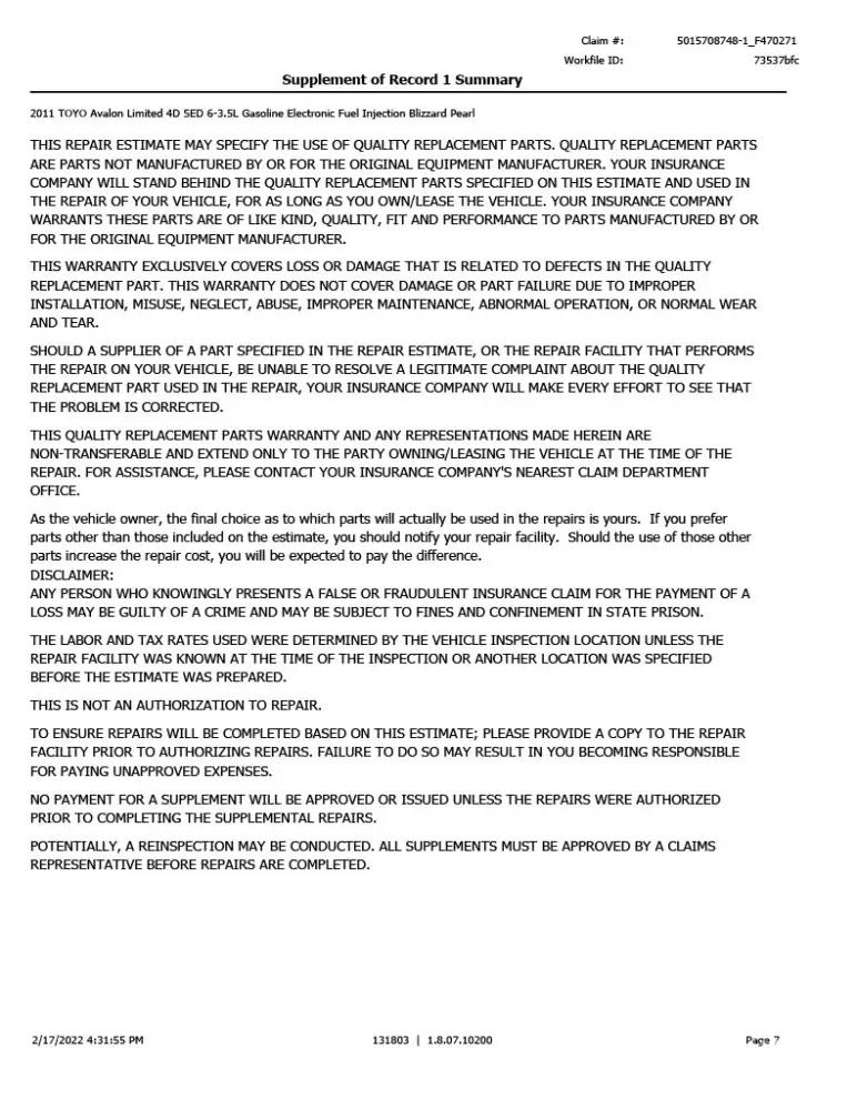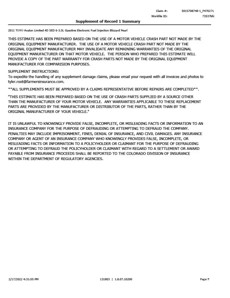 I was surprised the difference between the two estimates was so large. The problem is that the estimate from Farmers was conducted virtually, and isn't accurate (Example 1, Page 3 line 3 of the Farmers estimate has a note to check the muffler for damage, Example 2, no frame labor in estimate to straighten the cars frame). I brought this up but they aren't willing to change their estimate. Farmer's said they are also not willing to have an in person adjuster look at the car either. Farmer's told me my options are: