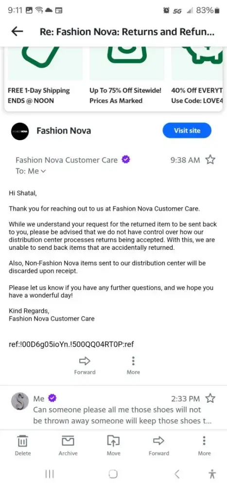 I made a huge mistake by getting my labels mixed so the package that you will be getting is supposed to go to nike and nike is getting the return that fashion nova is supposed to be getting i tried my best to intercept the packages but had no luck with that so i called nike and they immediately told they will return the package to me they was very nice about and understanding. So now i am trying to reach out to fashion nova but you guys have no way we can verbally talk to someone and that is crazy to me and that shows you really dont value your customers the only way to contact you guys is by mail you can at least have a chat option. I spend a lot of money with fashion nova so i sent a email when they fibally responded i was told that they have no control over wrong items being deilivered and they will discard upon arrival i refuse to believe that someone throw away a pair of shoes that cose $150 someone is going to take those shoes i am willing to pay for postage i dont understand this process at all