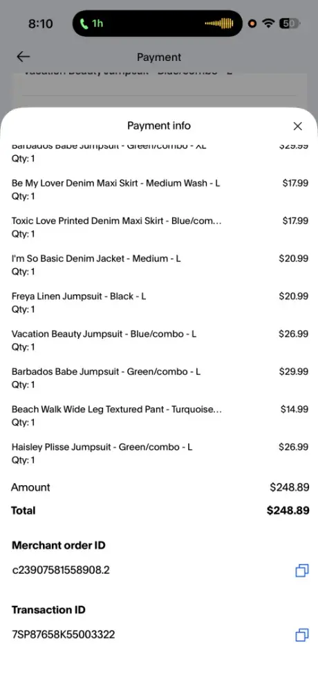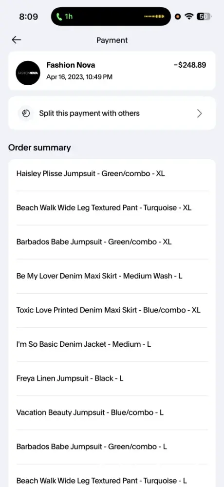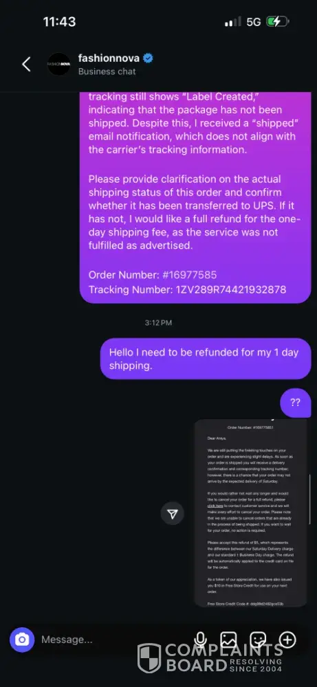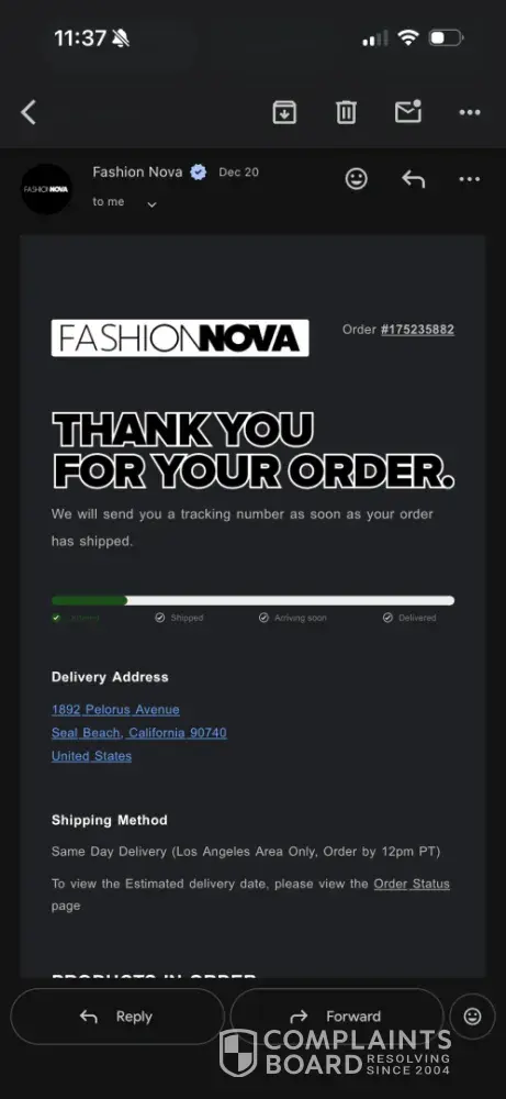 I Order clothing from fashion Nova on X-XX-XX in the amount of $211 order priority next day shipping $14 shipping to
