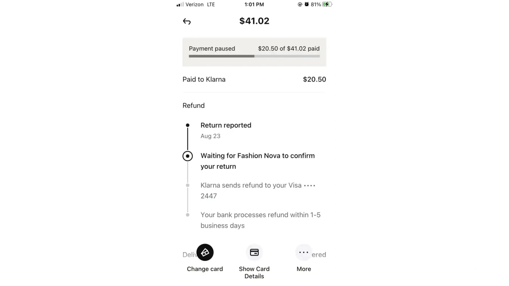 I returned an item to fashion nova in June. It states my return is in progress and klarna is waiting for fashion nova to confirm, Mean while My card has been charged twice already. on 06-23 and 06-25 for $10.25 each time. The order reference number is XL2VKPN6-1. Klarna states I am due for another payment on 08/29/22. I should have no payments for this item. Please advise