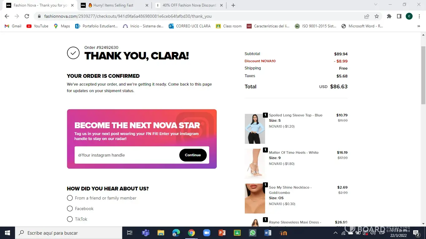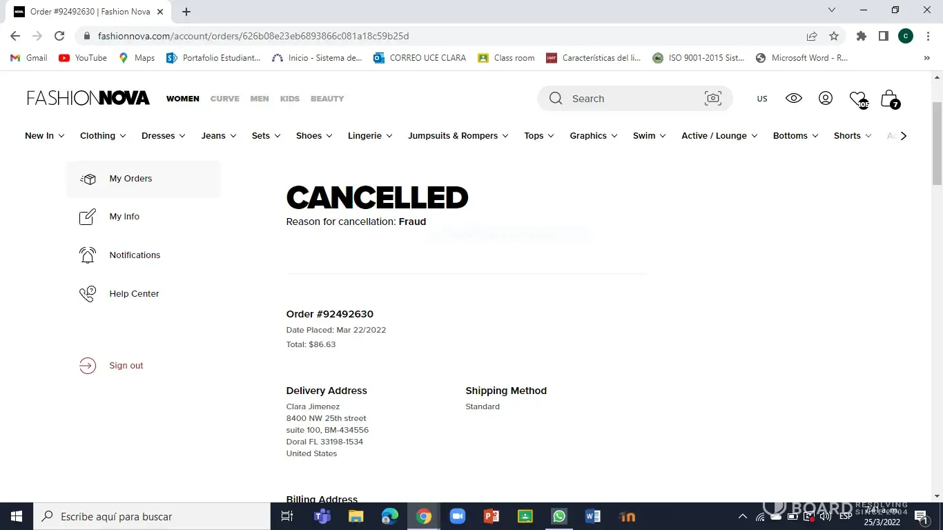 It arrived on 15/2 and greek customs e-mailed me that there was no invoice from Fashionnova's behalf and they couldn't process the clearance. According to DHL ,they asked fashionnova for a copy of the invoice but fashionnova refused so the order was sent back at 21/2/2022 . Fashionnova is supposed to refund orders that are sent back once they receive them so all I had to do was wait. But it's almost been a month. On 9/3 I contacted fashionnova's support on twitter since I never got a response from their support on their website, and all they said was that I had to wait. Today I asked DHL for a tracking number of the package that was sent back.