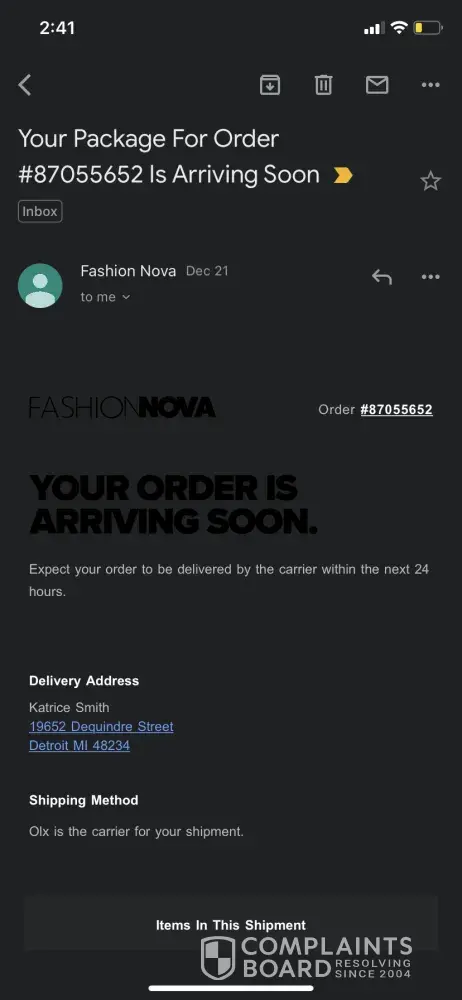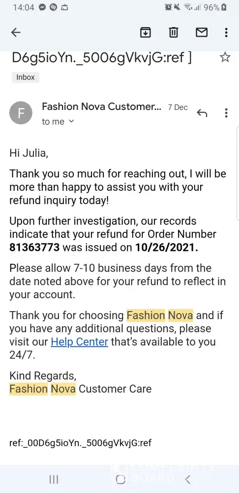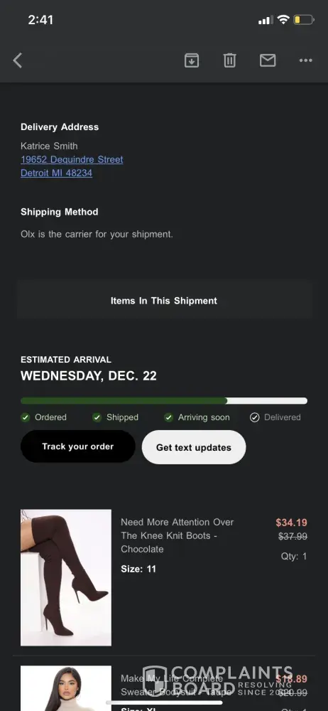 I made a purchase November 30, 2021 for $173.54. Two days ago which would be December 15th2021, I received an email saying my order was delivered to my address and it was false ! I've contacted fashionnova every day since then and all I get is that it's not their fault I didn't receive what I paid and ordered for. This was everyone's Christmas gift and now I don't have money or able to get a refund to the original payment method, and my household won't have Christmas . I am furious !