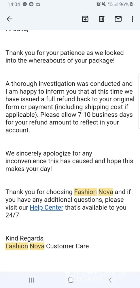 I placed my order back in September. 1.5 months later i didn't receive my order. After getting in touch with Fashionnova, they told me that the carrier lost my package in transit. They told me I'd get my money back. They told me they processed my refund on 18.11.21, i waited long enough and they decided to contact them again, they told me that the first refund they did failed, and they processed another refund, which i was supposed to get "shortly". I still didn't get my money back. I don't want this dishonest business to take advantage of people and steal their money