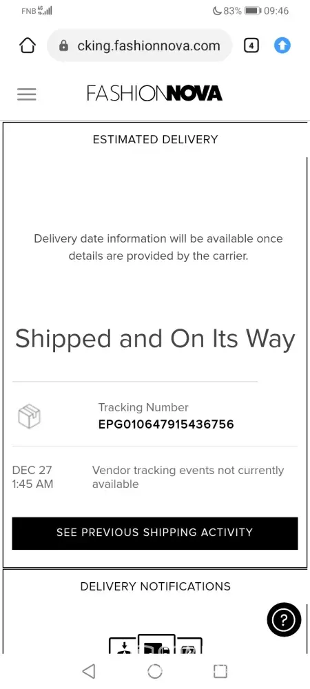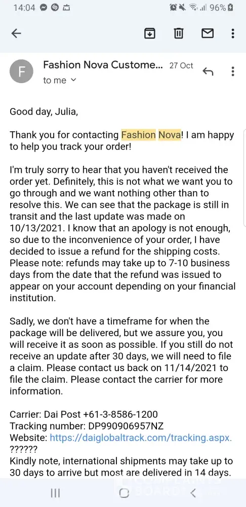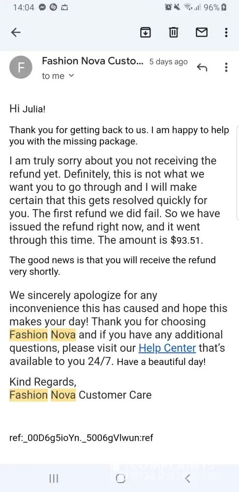 I ordered from FashionNova's website, Got express shipping, didn't come when it was supposed to so they refunded me my shipping cost which was great. Now it's been over 3 weeks still no package, no updates and nobody from customer service is emailing me back. Which I find funny because they were so responsive up until they date they gave me which they'd start the refund process.
