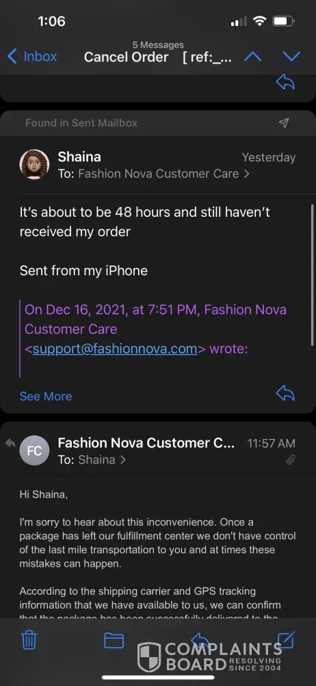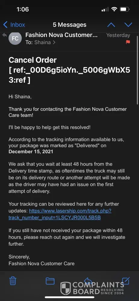 On 12/13/2021 I received notification my package had arrived to my front door. I immediately went out to pickup and no package was found anywhere. I checked with my neighbors and no luck. I immediately tried to contact Fed Ex and Fashion nova but no luck. I also payed extra for a faster delivery. The package was for a birthday gift. I haven't heard from you other than an email to wait 48 hrs. I've been a loyal customer for over 2 yrs and I would like this issue to get resolved. I also wish to cancel my order. Please help me bring this issue to a conclusion ASAP. My phone #[protected] & email is: [protected]@gmail.com
