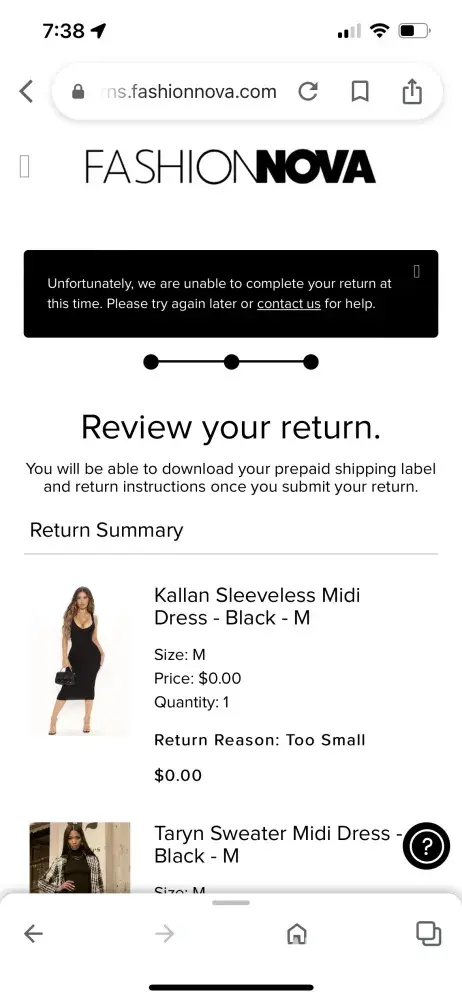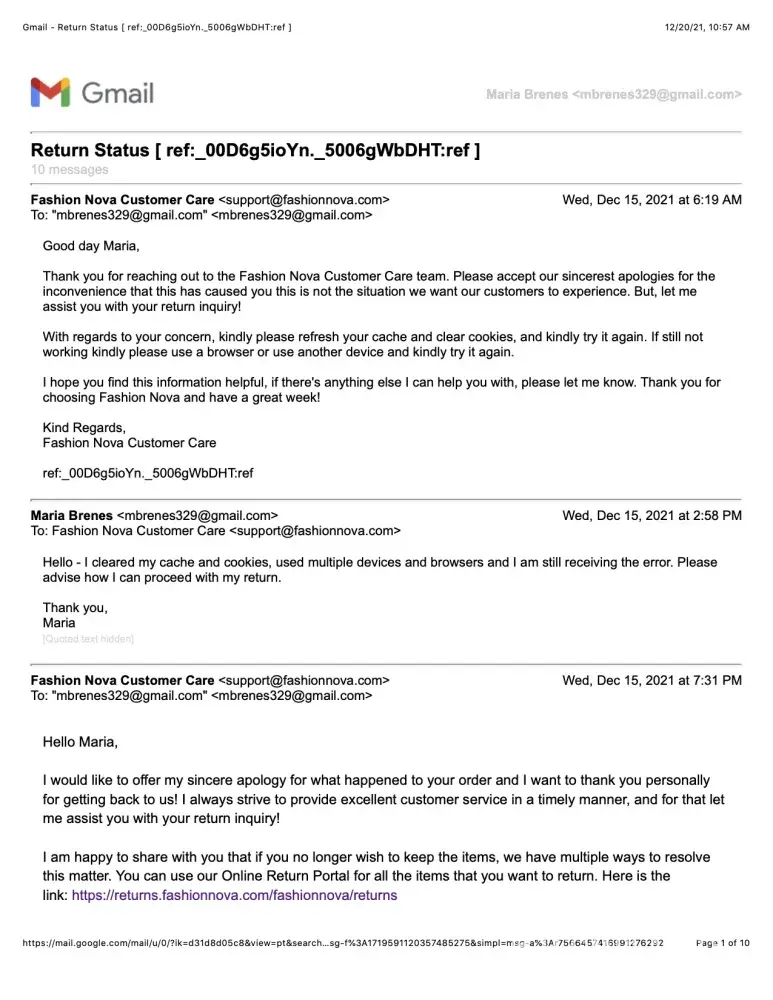 My issue is with Fashion Nova's Return Portal. I am receiving an error message when attempting to process my return. I reached out to customer support and have exhausted all recommended steps to try to resolve the issue to no avail. I have done the following: