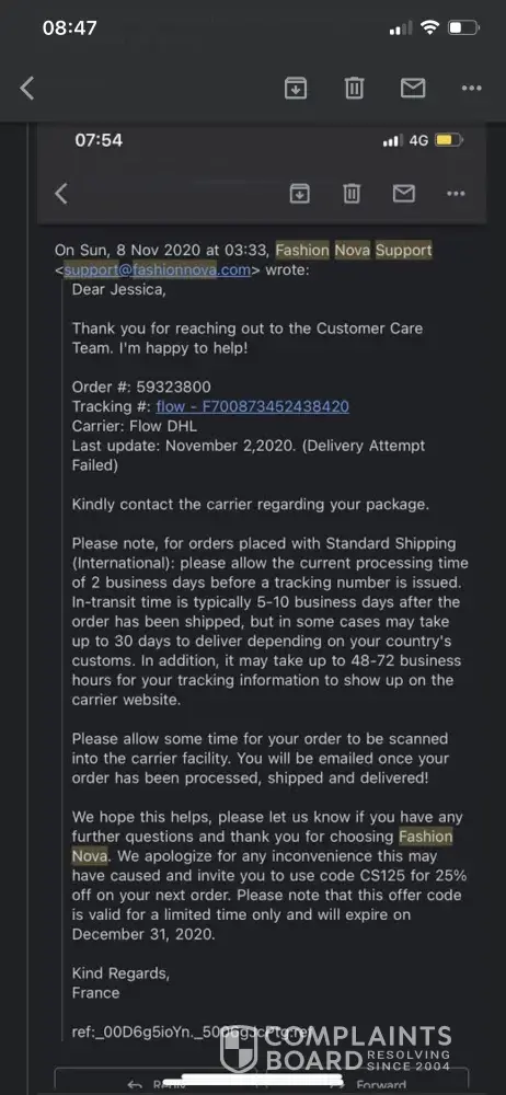 Received a text from DHL, stating my "shipment" was on the way...I got the address and name of the Receiver. Contacted Fashion Nova again, it's not their problem, they got their money and let's be honest, they don't care.