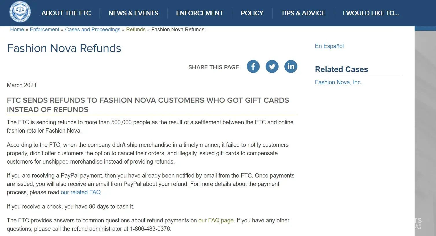 Fashion Nova SCAMMED ME. I was suppose to receive a refund on my order but never did. Their representative emailed me saying it was issued and sent to my email which I NEVER GOT! I told them this and they just repeatedly say they sent it and refused to do anything about the fact I have not received anything even though this order was returned over 2 months ago! In addition, I talked to the FTC and found out it is illegal for Fashion Nova to issue gift cards in place of actual refunds. When I brought this up they stopped replying. I am extremely disappointed, frustrated and I just want my refund asap.