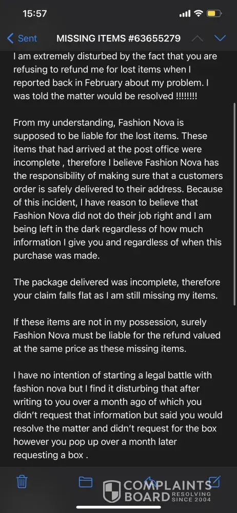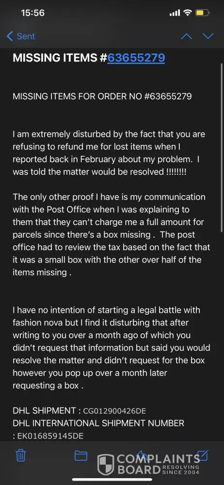 Desired outcome: Due to the fact of how Fashion Nova has treated my case and who they do business with, Lasership, I want my money back. I don't trust Fashion Nova anymore.