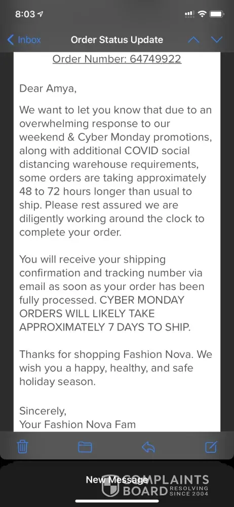 I placed an order on Nov.30th for an amount of $103.92 from Fashion Nova. I received an email on Dec. 2nd expressing delays due to COVID and large Black Friday and Cyber Monday Sales. And then on Dec.7th I received an email expressing that my order has been packed and is ready to ship! It has been close to a month since I received the email of my order...