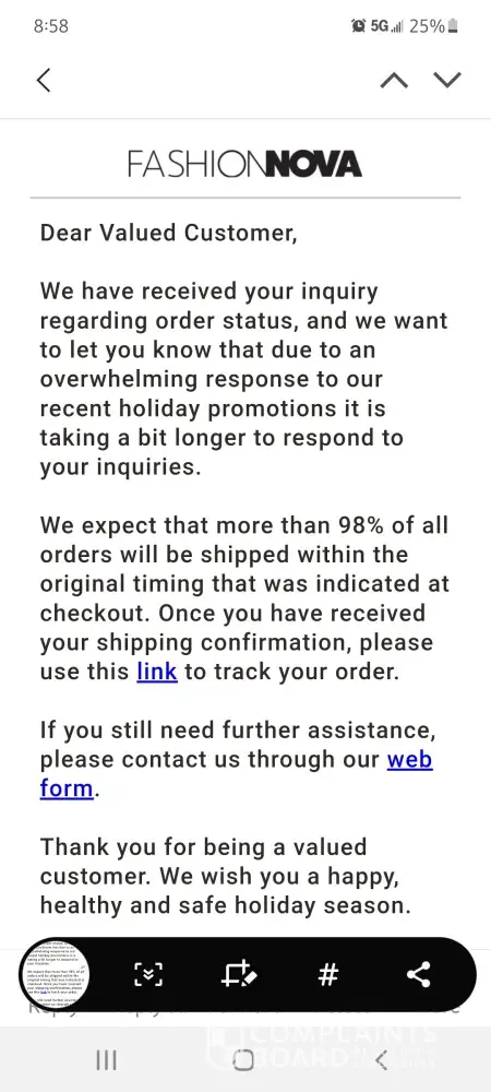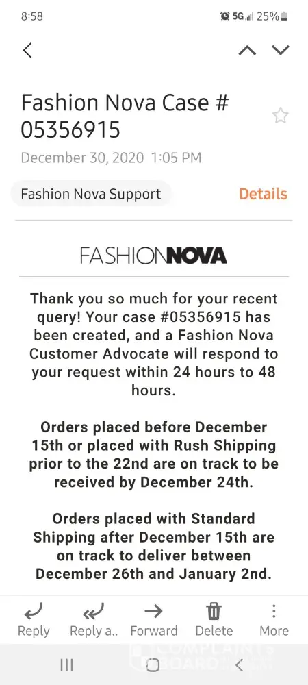 I have sent and 3 emails to fashion nova men in the following weeks with screenshots and my order details and still no response on my missing order.