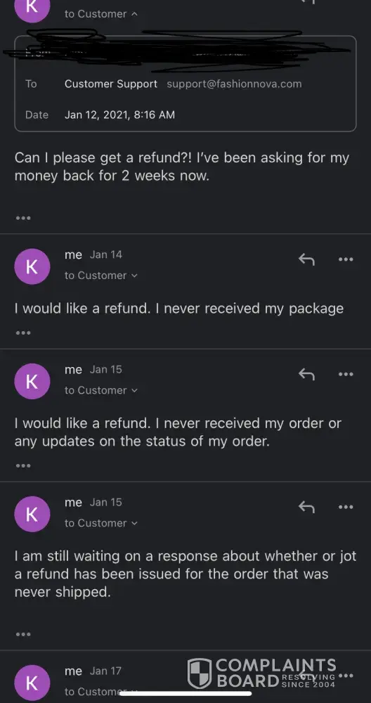 I purchased 2 items on november 29th, 2020. My shop app was connected to this purchase so I could track it directly from the app. According to the shop app it said my package had been delivered on dec 12th 2020 but I never received anything so I contacted customer service twice with no response. Got an automated email dec 16th 2020 that my stuff was on the way. Customer service emailed me on dec 16th as well and told me my package had already been delivered. So then I contacted customer service for a 3rd and 4th time because they suck at responding. They weren't super helpful but did tell me they filed a claim on my behalf since I never received my items. I responded 10 days later like I was supposed to with no response again. Emailed them 2 more times and finally just got a response today (jan 15th, 2021) that my claim was denied because according to the carrier, the package was delivered to the correct address. This is absolutely ridiculous that this happened, not to mention with the slack and slow customer service. I was intending to get a refund because fashionnova does not deserve the business they are getting. So, i'd like a refund but if that is not possible, I would either like my items re-sent to me, or just to have a store credit for the amount of what I originally purchased. Also, i'd just like to mention that I researched fashionnova issues with delivery and I was astounded at how many other people worldwide have had the same issue as me. This is so ridiculous. I just lost money and you just lost business. Give me my freaking money back, this is not right.