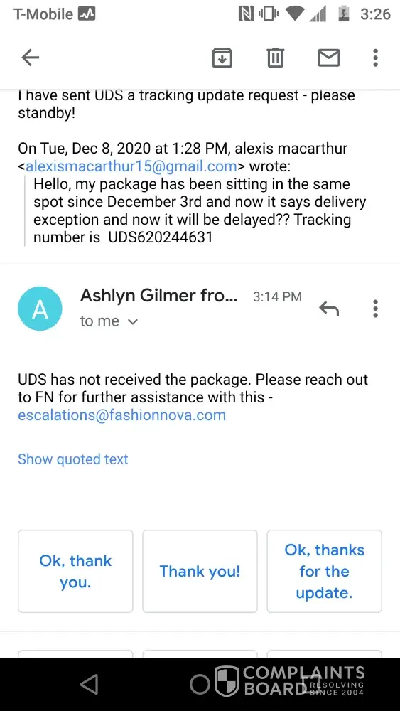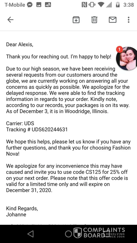 So I ordered product on 11/27. The tracking came across and said product would be here 12/8. I have yet to receive my product. When looking up the order it states to contact USD( in which I did) with questions regarding my order and shipping. However upon speaking to someone at that location they stated to me they have not received any product from fashion Nova with my order number. I have tried to reach fashion Nova numerous times with no reply. I have ordered here before without any problems but I will not be ordering from them any longer