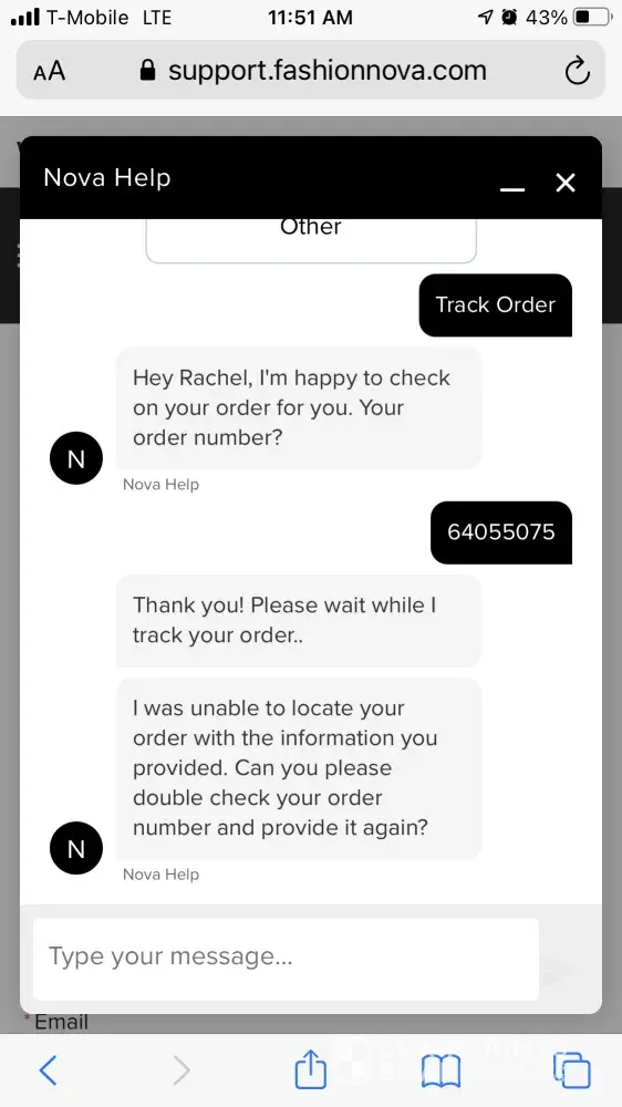 Hello, I placed an order on November 29th for $80 and it's been nearly 3 weeks and I have not even been given a tracking number or shipment date! On the website it says you should receive tracking Information within 4 days and it's been 19 days and nothing. I have sent 7 inquiries to their support center with NO response and also tried they're live chat & the robot says she can't even find a order linked to my order number or email! I am LIVID also bc they SHUT their phone lines down completely so you can't even reach a live person. So I am basically just screwed and can't get in contact with a single person! I needed the items for a gift by this weekend smh. So dissatisfied and disappointed. Where is my order Fashionova?! You took my money and never even sent a tracking number.