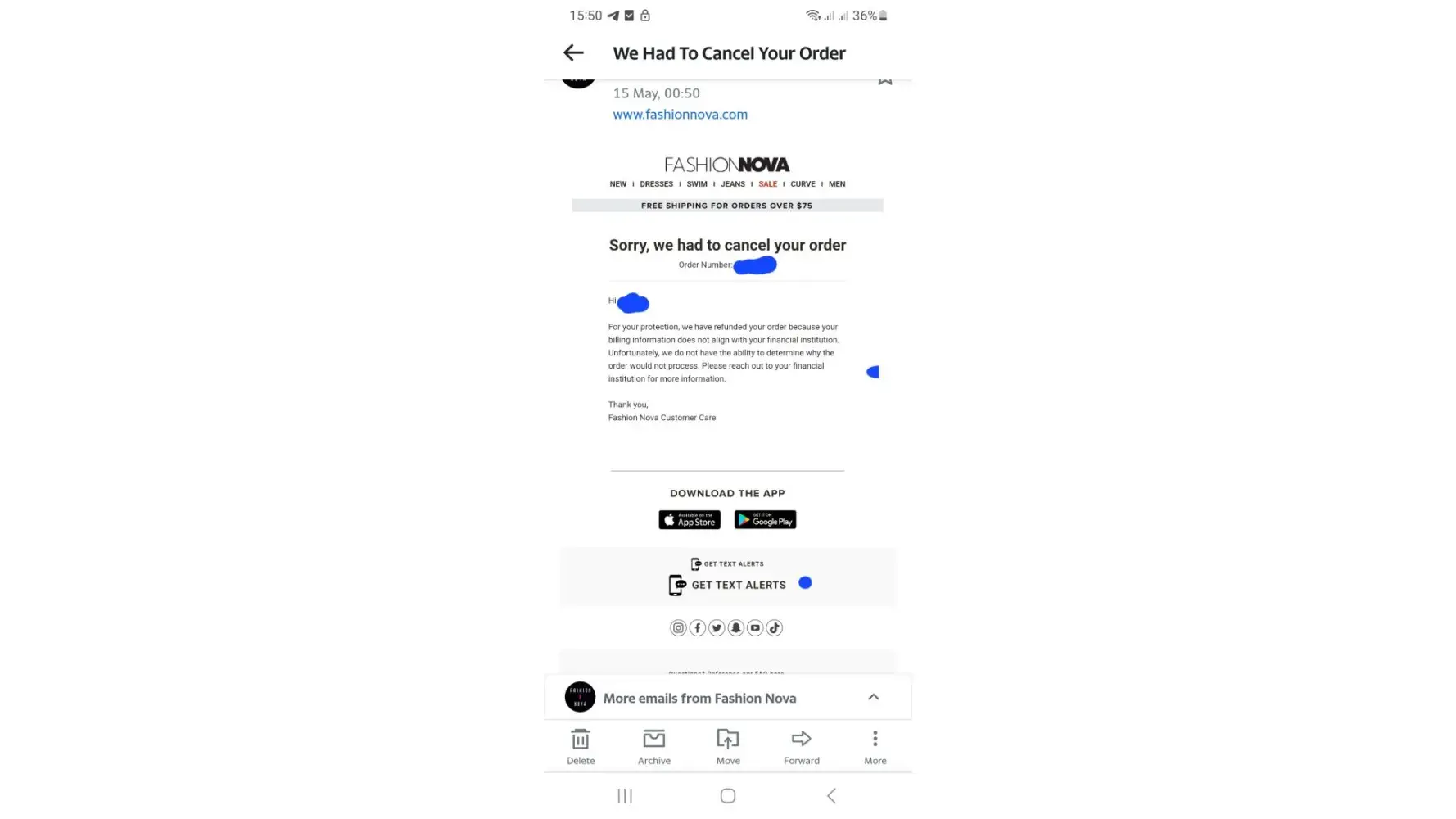 I ordered on fashion nova on may 15th using a visa debit card. Got a confirmation email with my order number. Only to get another email of order cancelation by fashion nova stating that my billing address provided when ordering is different from the one provided to my financial institution. It's been 5days+ now and i still haven't gotten my refund yet. Fashion nova please i want my $144.
