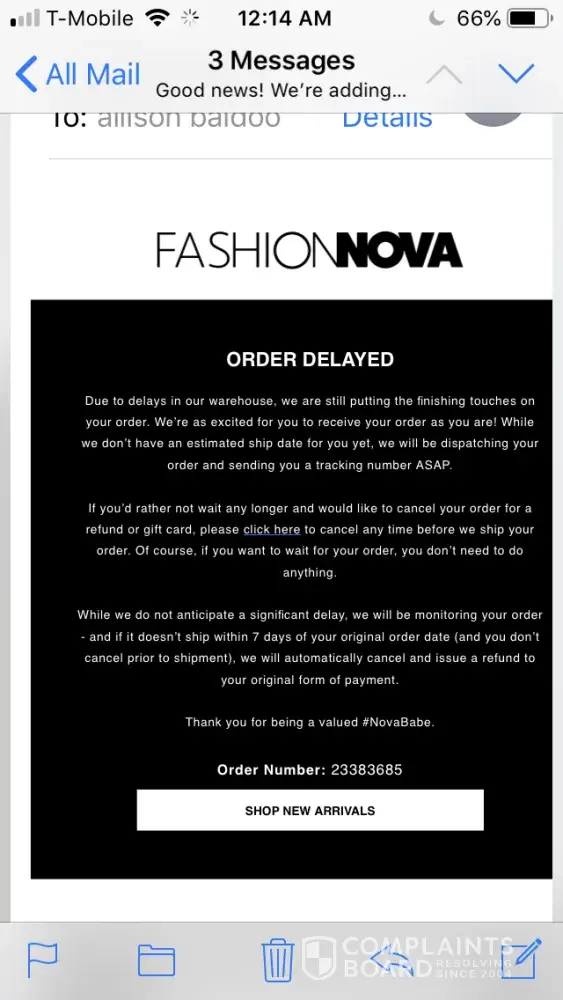 I ordered $208 worth of items from fashion nova and instead of shipping me my items they continue to lie to me that there is a delay in shipping my items due to warehouse . They have been using this excuse for awhile now and they have even sent me an automated email that my ordered is delay and if it is not shipped within 7 days of my order date they will cancel my order . I want all the items that I paid for . I have already reported them to better business bureau and I have also contact on the 7 eye witness news to investigate the malpractice of this company since many of consumers have complained about not receiving their items