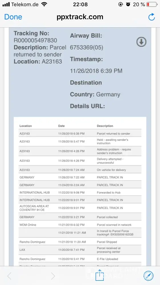 I just received the notification that my package will be sent back to the sender (aka you) I really do not understand why. The parcel just arrived to Germany and now the reason for the package being sent back, is due to some error with my address. That cannot be, since I have received items from you, over the past few months, to the exact same address. I really do not want a gift card nor the money. I really just want the package. I don't have any information whatsoever on who/what delivery service has my parcel. I have no tracking information or company name.