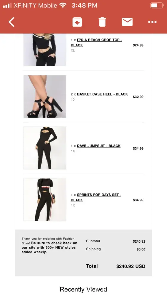 I ordered 10 pieces March 15, 2018. The order showed delivered on March 17, 2018. Two items were received which was a pair of heels and a teddy lingerie piece. The rest of my items were not included one of them being a robe. I wrote fashion Nova several times and they blamed the post office. The shoes I received were too big so I needed to make a return anyway. When I arrived at the post office to inquire about my full order and return my shoes; the post office informed me that the shoes I was returning was the same weight as the original package that they received from fashion Nova at the time of scanning it in. That let's me know that my items never left the warehouse. My birthday trip was messed up due to this and I have yet to receive a refund or proper communication to get my situation resolved. I'm so upset right now and I feel like I just gave them $189.00. DONT USE #FashionNova! You may or may not get your stuff and it's extremely difficult to get a response on your money if you get one at all because I did not!