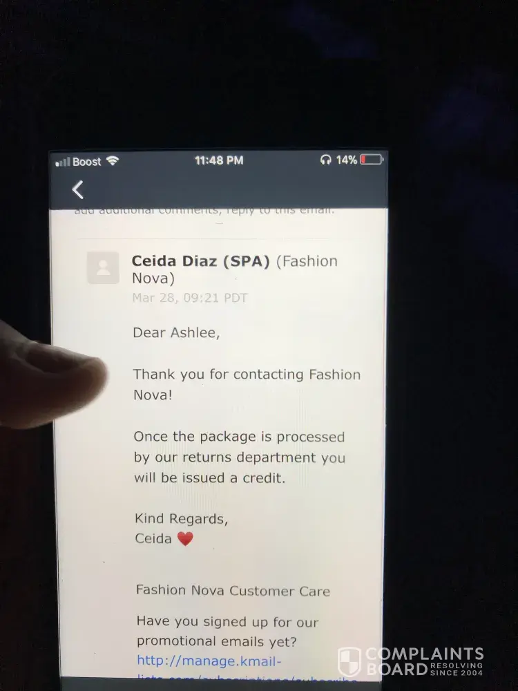 I finally got into the hype of buying from fashion nova and was only met with an unprofessional business. I returned my package perfectly, the tracker says it got delivered but I still haven't recieved my store credit. No one has responded to my email either and they don't have a contact number that'll let you speak with someone, it's just a message. If they don't solve this problem I won't shop from them ever again.
