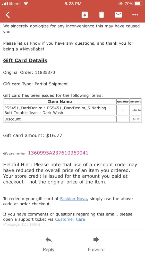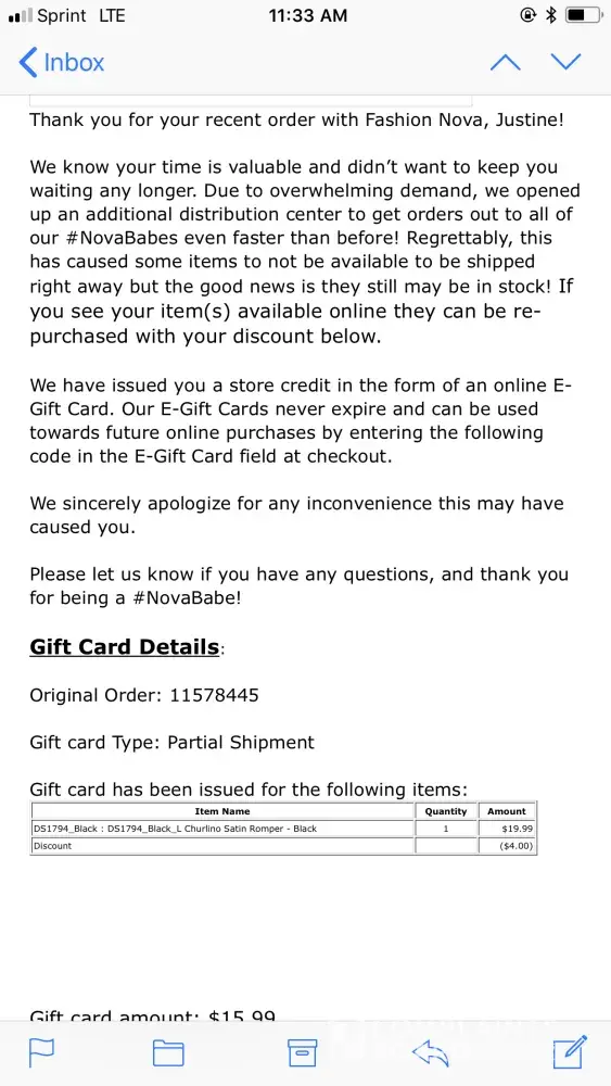 I ordered several items from Fashion Nova. The next day I received an email stating that due to the demand of shipping and different warehouses they couldn't send me one of the items and they would issue me an egiftcard in the amount of $15.99 and if the item was still available I could order it again. The item is originally $19.99 and i paid shipping so if i was to order it again I would have to pay $19.99 plus the shipping fee again. This is absolutely absurd. Then i emailed them about it and they gave me a code for free shipping but it can't be used with any other codes so again I would pay more than i originally did for the item. Why if it is in stock can't you just send it to me and keep the egiftcard? Why would I pay more for an item that I already purchased? This makes no sense and is really horrible customer service. I just can't bekieve it.
