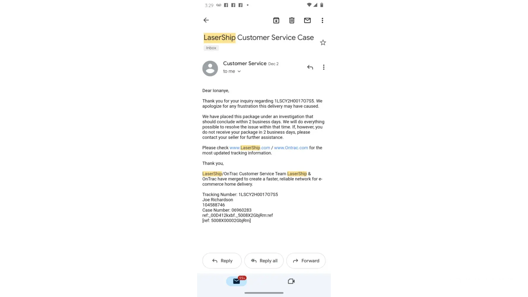 Went to visit my son in Charlotte for his graduation, so I had my items sent there, when I tracked my order it stated that the items would be delivered before I returned home however, when I checked again for tracking it stated that the items was delivered on 12/19 however when I checked for the packages on both 12/19 and 12/20 before leaving still no package. Once I got home my attention was to follow up with fashion Nova however i became ill with COVID and just now recovering I tried to contact you via phone however with no success so I still never received my items/package for order #[protected] so I would still like to have them but if not able a full refund to the original payment no Fashion Nova credit