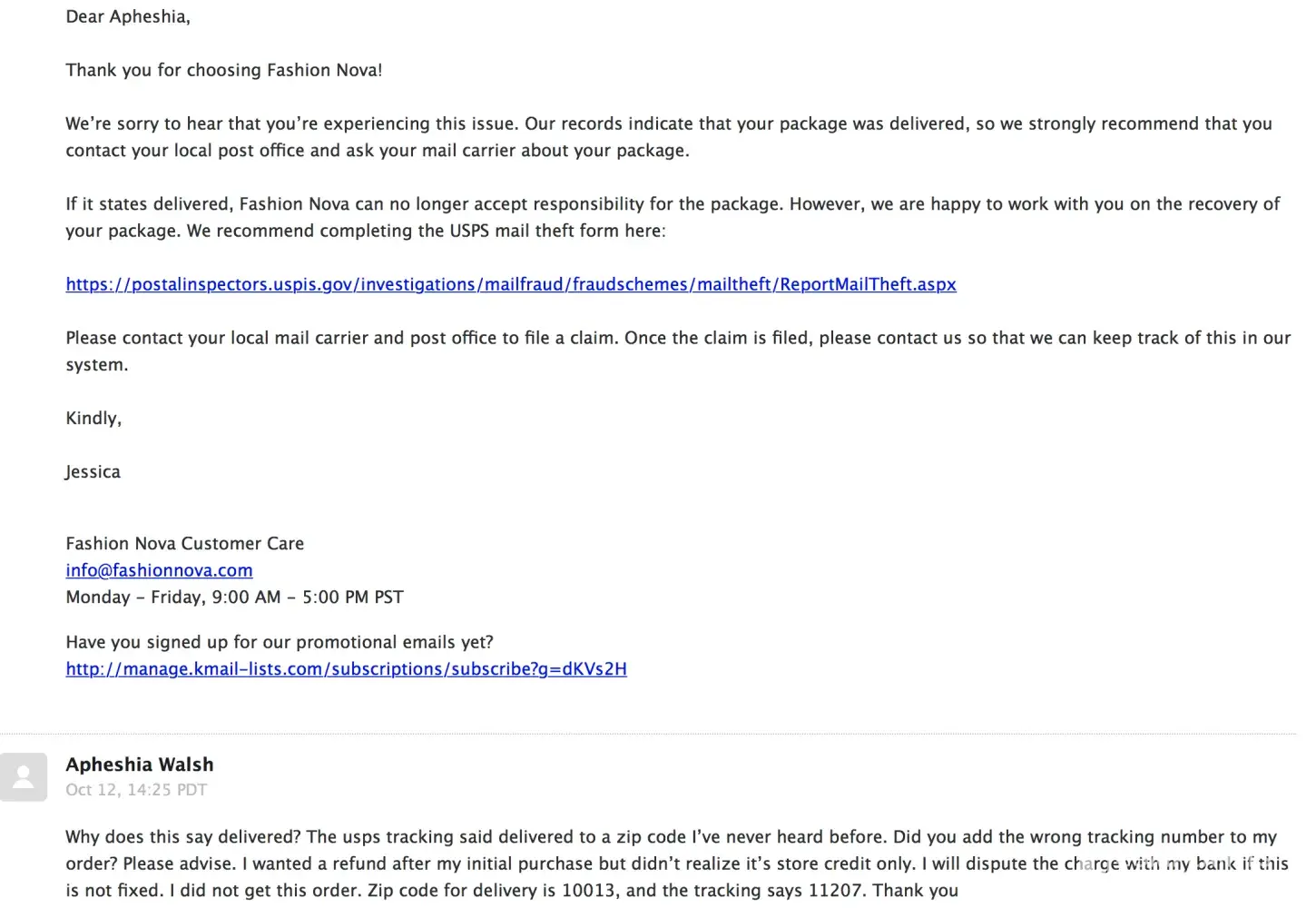 Fashion Nova shipped my package to the wrong address than the one on file. its impossible to contact them by phone and completely unhelpful by email. i was told in my email attach that fashion nova is not responsible for orders after it ships. so even if they accidentally ship your order to an address you have never heard of it is not their fault. THIS WAS MY SECOND TIME ORDERING FROM THEM, THE FIRST TIME THE PRODUCT QUALITY WAS HORRID BUT I WASN'T AWARE OF THE NO REFUND POLICY SO I HAD TO USE A STORE CREDIT AND ORDER SOMETHING ELSE. NOW I CANT DISPUTE THE CHARGE WITH MY BANK AS THIS WAS STORE CREDIT PURCHASE AND I AM OUT $200. ORDER# #8412641 AND #8312696. STAY AWAY, THEY ARE THE WORST. THEY DELETED ALL MY PRODUCT REVIEWS ON THEIR SITE AS WELL, ANYTHING THAT WASN'T 5 STARS GETS DELETED. VERY DECEIVING.