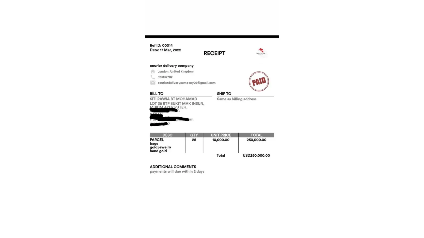 then after two days a man from malaysia called my number telling me my parcel is on hold because it was detected with money and has violated the law