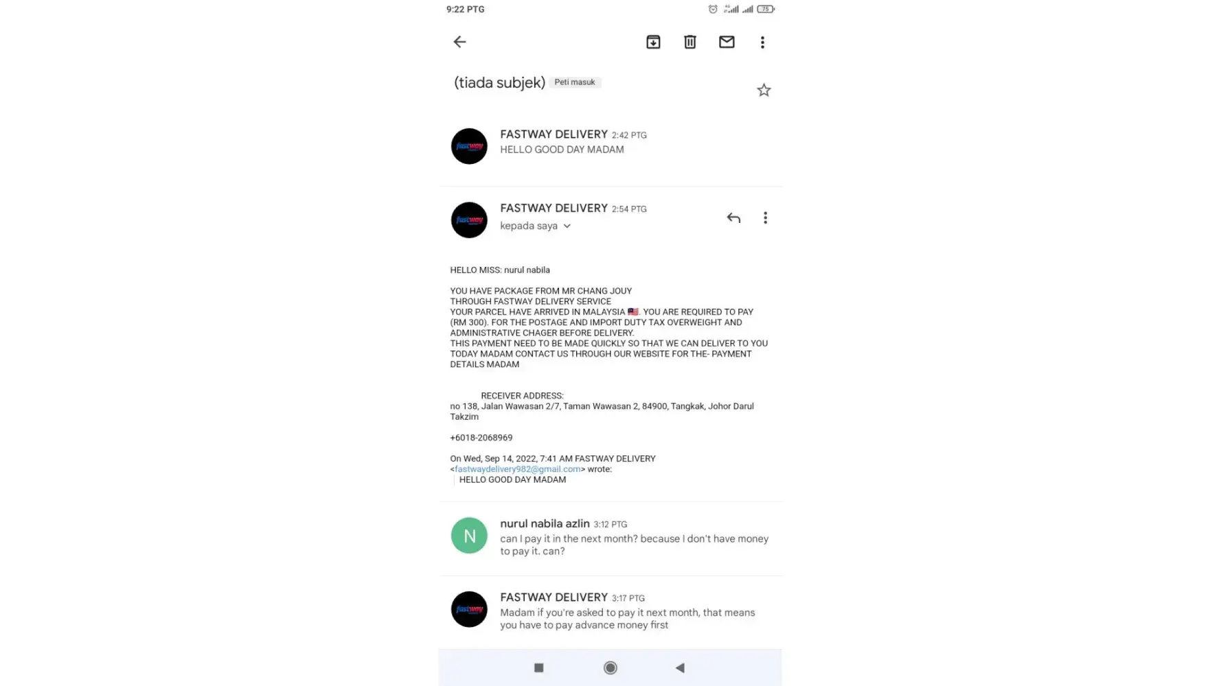 then i sent my scammer boyfriend the email asking me to pay 2, 940 ringgit in payment for them to deliver my parcel