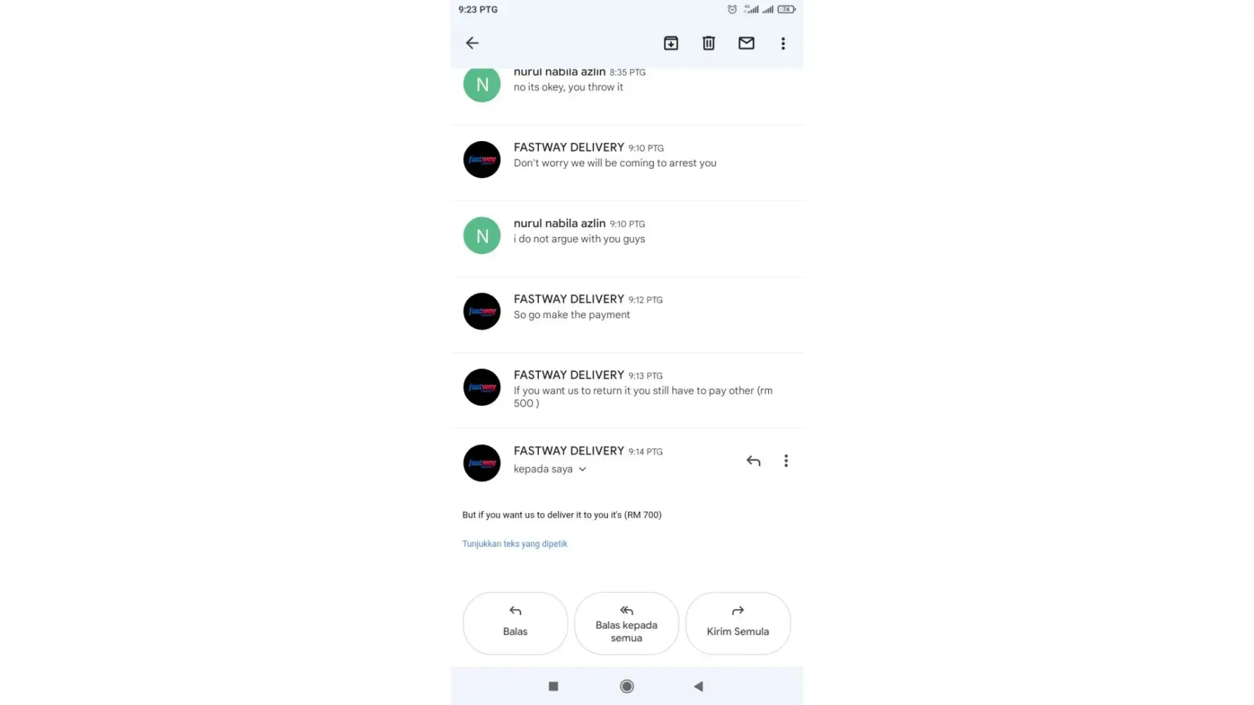 saya baru sahaja kena parcel scam dengan syarikat fastway courier ni, mereka mengugut saya untuk menangkap saya sekiranya tidak membayar parcel tersebut dengan harga rm1200. memang tak masuk akal langsung wey! mohon ambik tindakan pihak pengurusan, saya tak nak orang lain menjadi mangsa lagi selepas ini, disebabkan ini, saya telah mengalami depresi yang membuatkan saya takut untuk keluar bekerja, sila ambik tindakan!