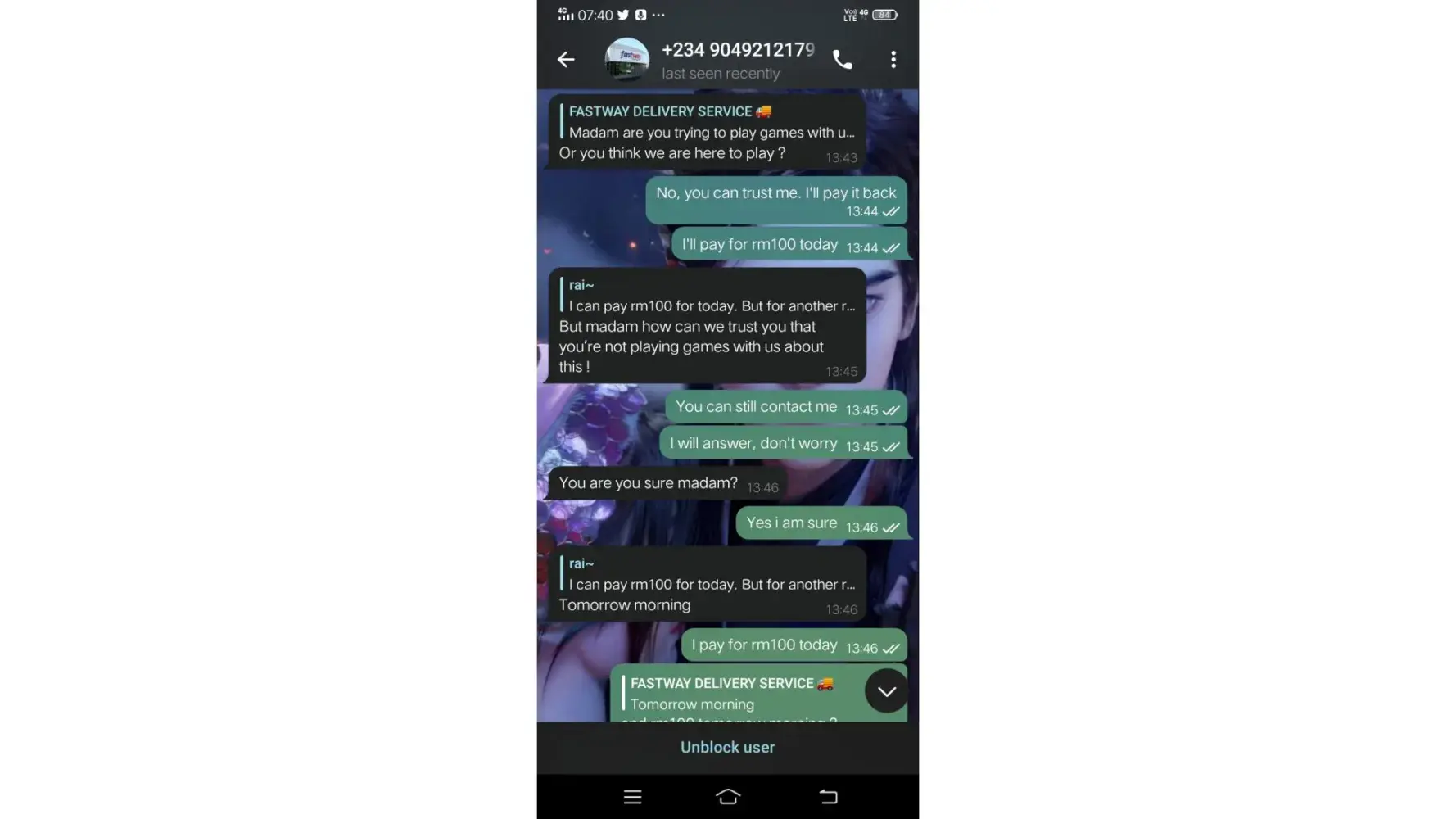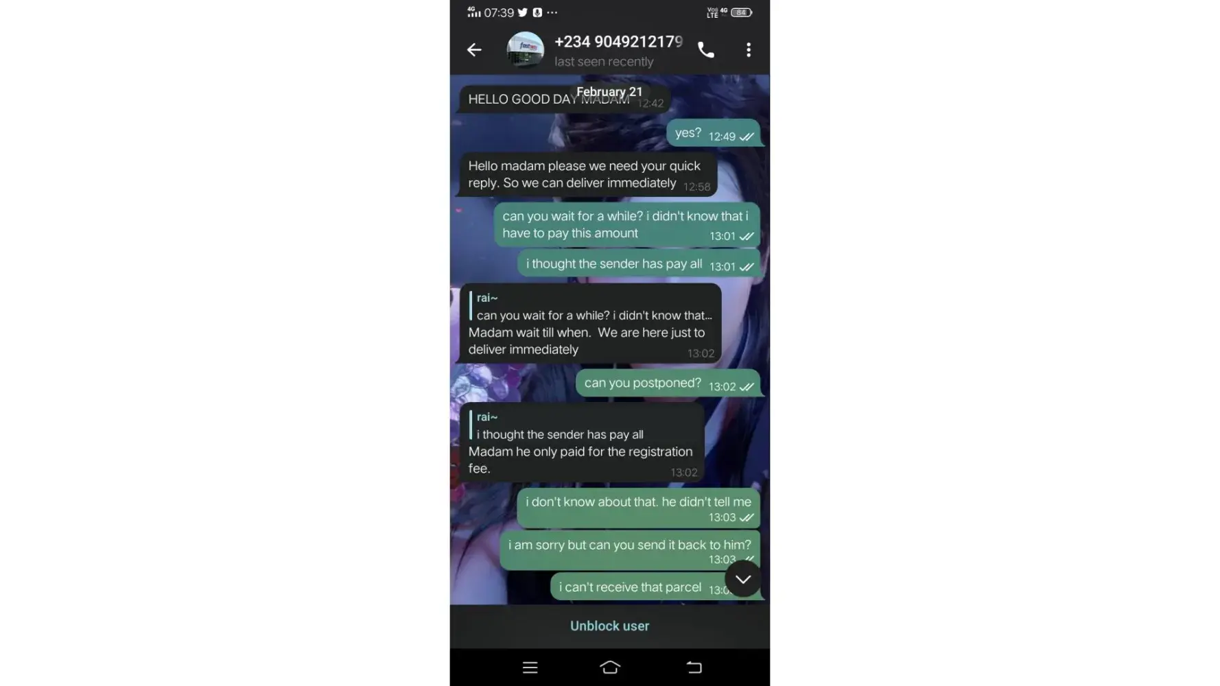 Habe auch dem Herr Lee eine WhatsApp gesendet und ihm erst mal Gratuliert für den Dubiosen Lieferservice, denn er dafür Ausgesucht hat. Die wollen das ich trotz dem das alles bezahlt wurde noch USD 2000. Ebenso habe ich ihm klar geschrieben das ich kein Geld bezahlen werde und auch keine Liefer Annehme, sondern die Annahme verweigert. Ich halt nicht so blöde bin, wie sie es gern hätten und den Dummen nichts wissenden bin und ihnen zuliebe spiele.