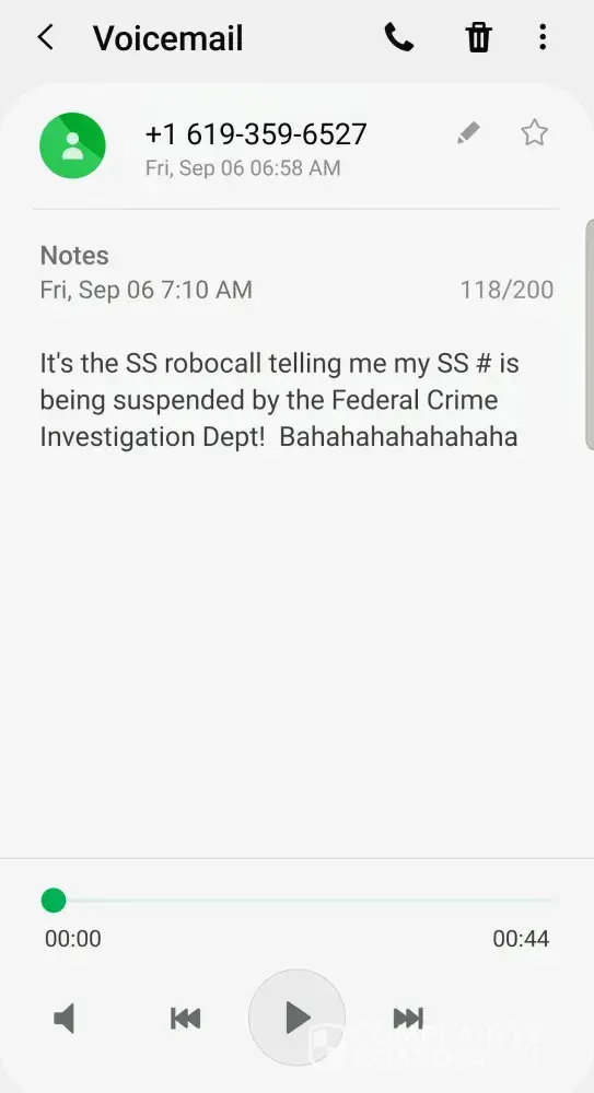 [protected] called me 9 time between [protected] telling me my SS# was being investigated by the Federal Crime Investigation Dept. and I needed to call them back. Never did, but may just to screw with them! It's so fun! Definitely a scam, don't give any info to them!