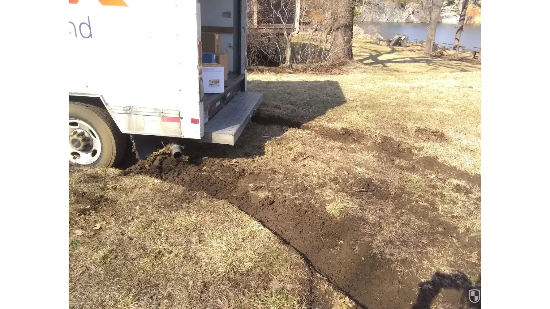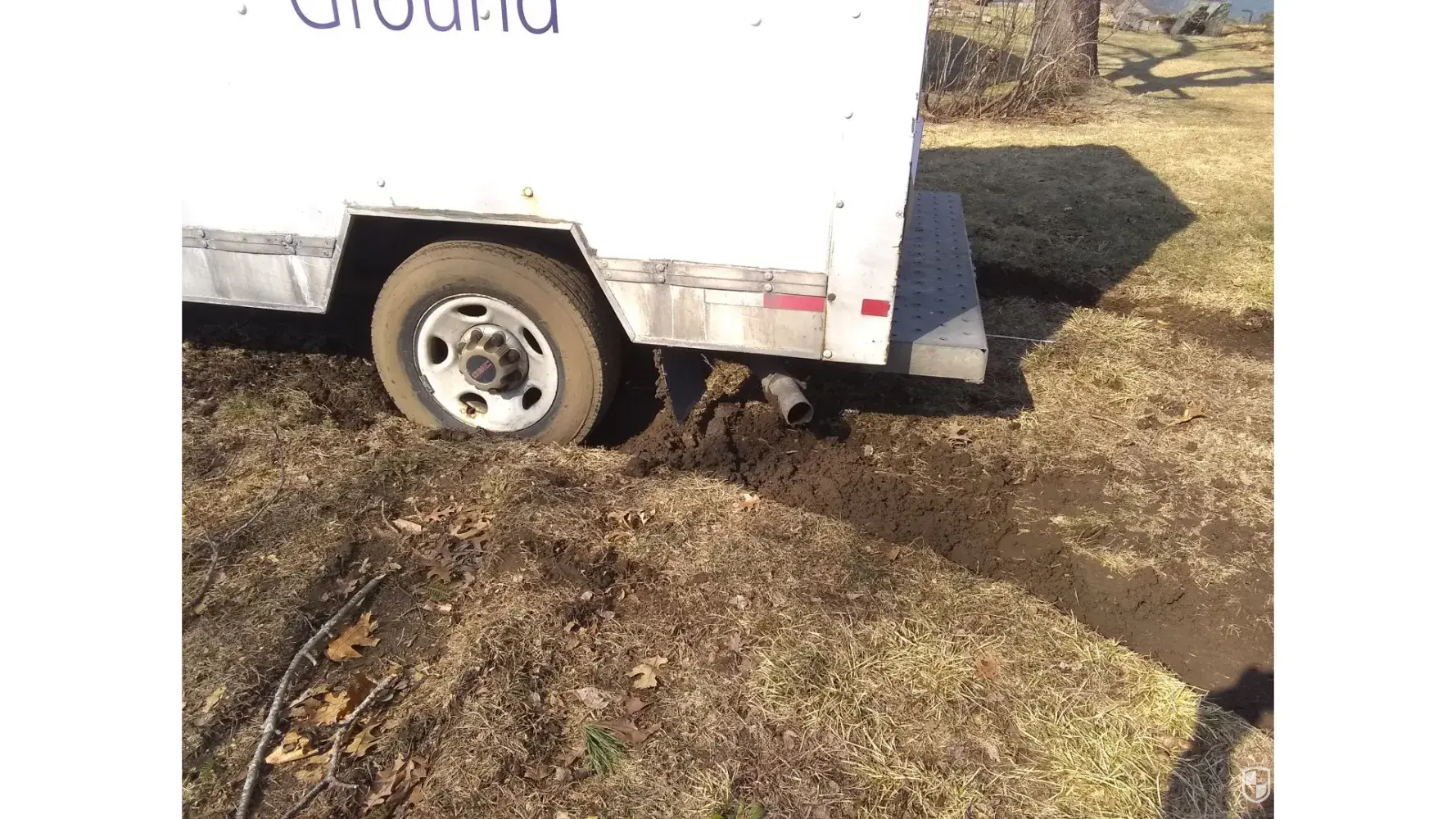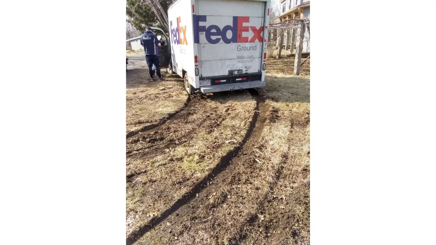 A Fedex driver has just driven over the lawn causing deep ruts. He got stuck and spun the wheels backward and forward, digging in deeper and destroying more turf. The tires are now in so deep that he and two other employees called to the scene can't move it at all. They eventually called a car hauler to pull the truck out.