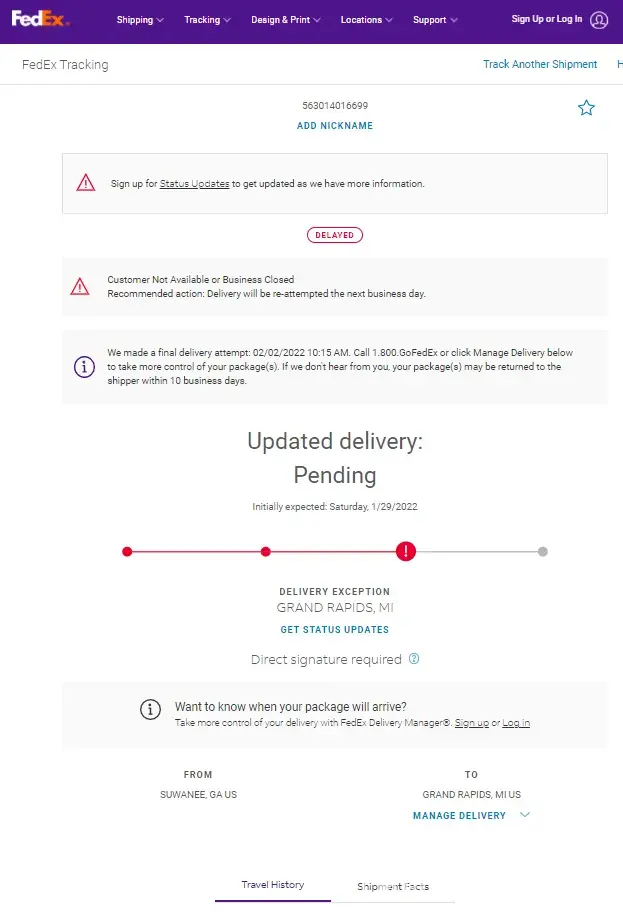 We followed Fedex tracking of a two part shipment, with a signature required. The larger expensive item was scheduled to arrive 2/7/22 so we watched all day. The track then said they had no information on it. The second item was to arrive 2/8/22 along with the first item. Neither arrived, with no information on its location. Delivery was now slated for 2/9/22. No show. Now it says "delivery delayed." We have inconvenienced ourselves three days, and no delivery. Given a choice Fedex will never deliver another item to us.